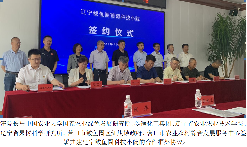科技小院在中国科协的领导下,在地方科协大力支持下,采取“科协领导,高校实施,老师指导,学生常驻,多方支持”的模式,服务地方农业产业发展,助力乡村全面振兴。辽宁鲅鱼圈葡萄科技小院是辽宁省“第一个科技小院”,是中国农村专业技术协会直属科技小院之一,由中国农业大学国家农业绿色发展研究院、沈阳农业大学、营口菱镁化工集团有限公司、辽宁农业职业技术学院、辽宁省果树科学研究所、营口市鲅鱼圈区红旗镇、营口市农业农村综合发展服务中心共7个合作单位共同组织,组建葡萄科技小院专家团队,入驻鲅鱼圈红旗镇,我校常驻人员将重点针对葡萄生产中存在的营养失衡及其品质下降等问题,开展土肥需求和果园土壤健康、镁肥营养与调控机制、配方施肥等方面的研究和技术服务。科技小院将作为农业资源与环境学科专业硕士实训基地、农民田间学校和科技大讲堂,广泛开展教学、科研和乡村振兴工作,同时定期为“营口红旗镇绿色生态葡萄产业融合发展示范园”提供技术咨询,为我省加快实施乡村振兴战略提供科技和人才支撑。