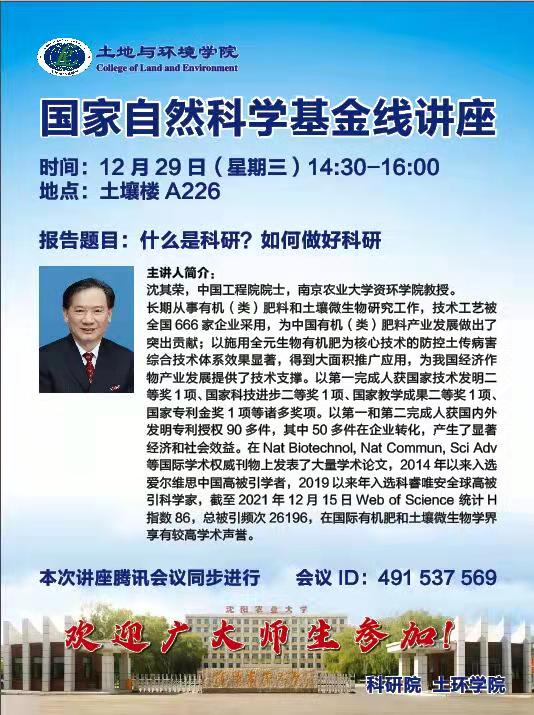 12月29日,学院邀请南京农业大学沈其荣院士于科学技术发展研究院举办的“沈农科技在线讲堂”科研讲座活动中做培训讲座,沈其荣院士作题为“什么是科研?如何做好科研”的线上培训。
