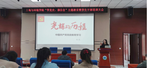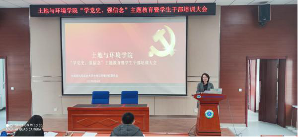 “学党史、强信念”主题教育暨学生会成员培训大会于土壤楼A座226召开。学院党委副书记袁玲老师、辅导员范超老师、乔鹏升老师,学生会、研究生会全体人员参会。会议由团委书记杜杰老师主持。