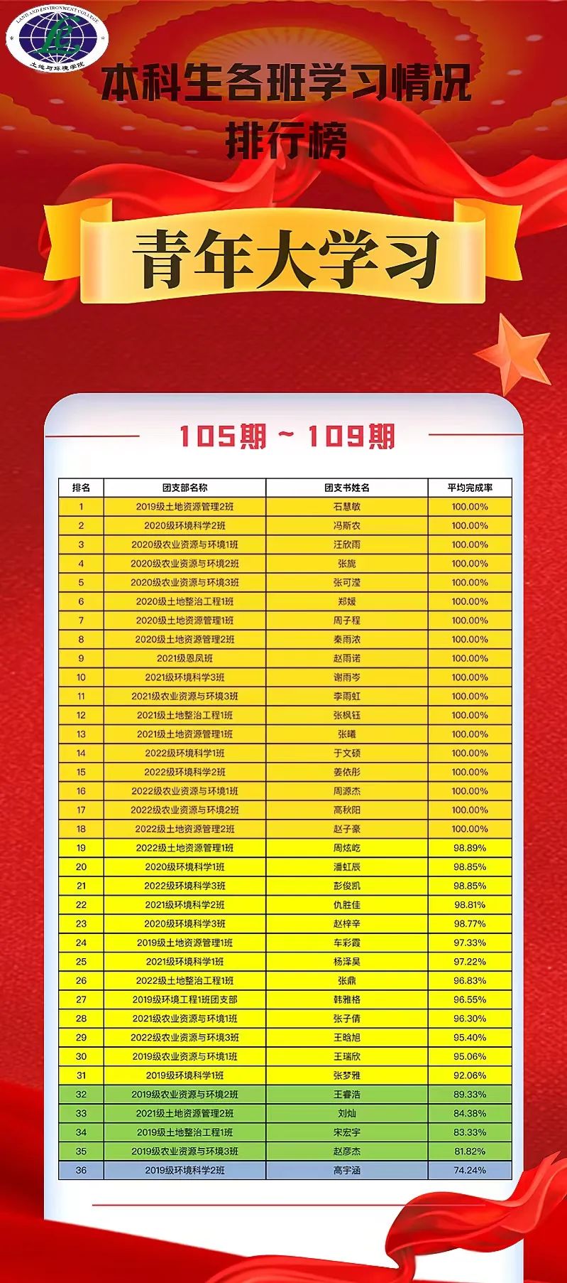 直播吧手机版 本科生共36个团支部,其中18个团支部学习率达到100%,团支部平均学习率均超过93%;研究生共13个团支部,土壤改良与农业节水2班团支部学习完成率为98.85%,团支部平均学习率超过75%。