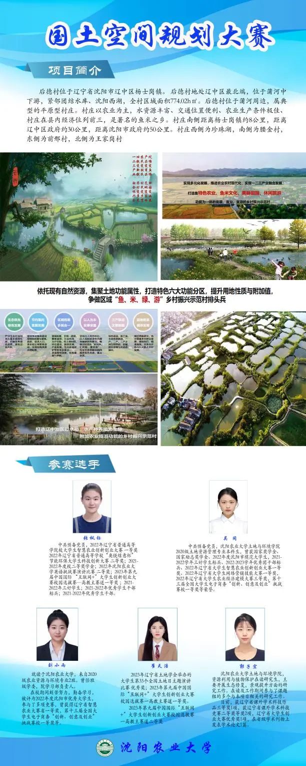 边振兴老师担任指导教师,2021级土地整治工程专业本科生张枫钰、崔天浩及2020级土地资源管理专业本科生吴同,2020级农业资源与环境专业刘小雨同学组成的“三色田园队”共同完成的《“鱼米绿乡,齐富家园”辽中区杨士岗镇后德村乡村振兴规划,基于农业布局优化的景观提升、土地整治更新设计》项目在决赛中获得全国二等奖。
