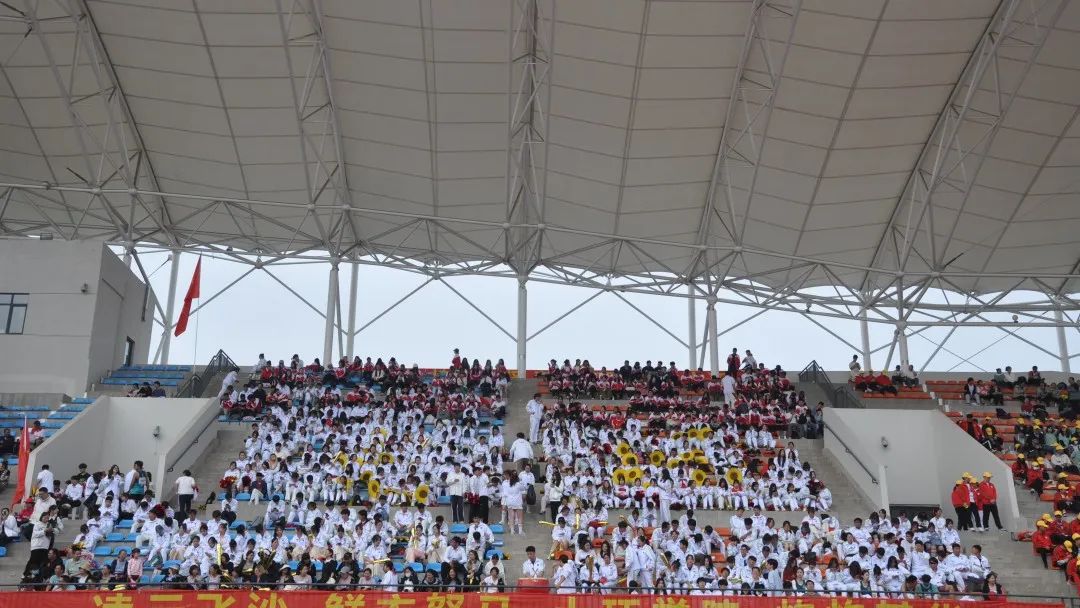 在《运动员进行曲》的激昂伴奏下,国旗队、彩旗队和全校各班级方队迈着矫健的步伐依次入场。土环师生高喊“保护环境,珍惜土地,齐心协力,共创佳绩”,昂首阔步走进会场。