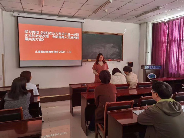 2020年11月10日,土壤教研室召开教学工作例会,学习并贯彻《沈阳农业大学关于进一步深化本科教学改革 全面提高人才培养质量实施方案》。会议由教研室主任栗杰主持,认真学习了方案各项内容,结合本教研室实际情况,对标实施方案中的各项发展目标制定了本教研室的五年工作计划,为专业认证工作顺利推进提供了良好的支撑。会议也对农资人才培养方案修订过程中存在的一些问题进行了讨论,最后由农资专业负责人张大庚进行了总结。